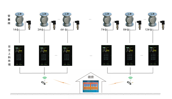 上料口側(cè):上料安全控制終端、電動(dòng)蝶閥,每個(gè)料倉1個(gè),各個(gè)終端通過網(wǎng)絡(luò)連接。