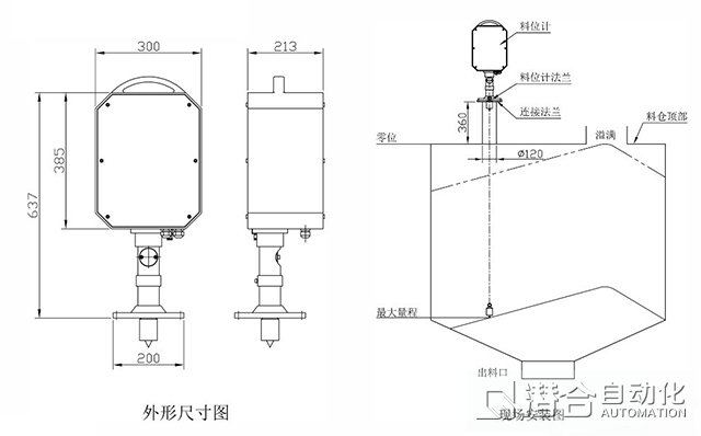 1)測量點(diǎn)的選擇:如料庫為中心進(jìn)料,探頭單元應(yīng)安裝在料庫半徑的1/2處,探頭與進(jìn)料口的水平距離要>1m,應(yīng)避開進(jìn)料口及下料口。